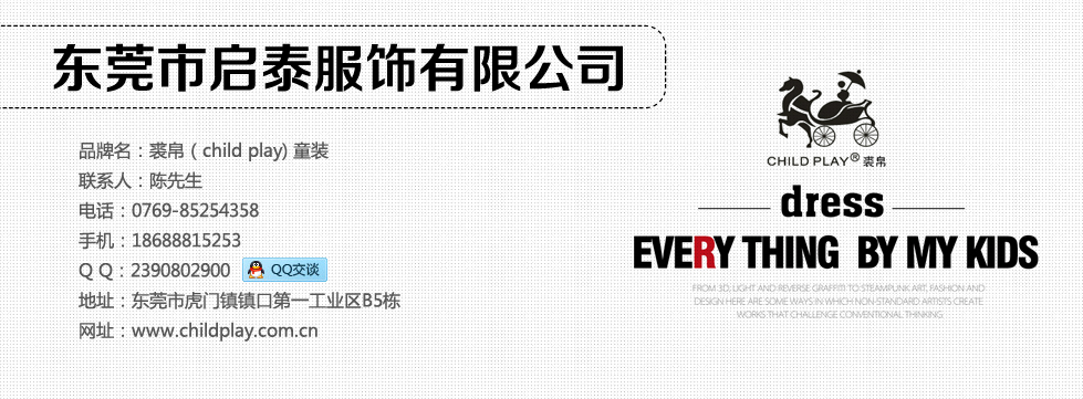 裘帛(child play)童装是东莞市启泰服饰有限公司旗下主打品牌,成立于2006年。产品研发采用欧美、日本、韩国最新流行元素,把"个性、时尚、环保、健康"的设计理念巧妙地融入到产品的灵魂之中,体现了"个性时尚、健康环保、充满想像力"的品牌底蕴。产品采用低碳、环保的纯棉等材质,注重孩子穿着时的健康性、舒适度和柔软度。在确保产品的安全性和舒适度外,产品的设计理念大胆创新,不拘一格,体现了现代儿童的"崇尚自我、崇尚学习、崇尚突破"的穿着理念。 在产品质量方面,裘帛童装严格按照国家童装安全标准执行,产品通过国家质检部门检验合格,确保裘帛童装的每一件产品的品质保障。裘帛童装的研发、营销团队是一支充满理想、抱负、激情的年轻有活力的团队,誓必要把"裘帛童装"打造成中国第一个性时尚童装品牌! |