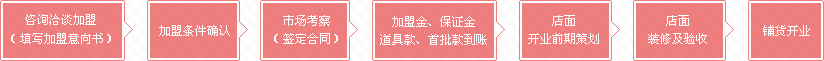加盟优势 ·加盟支持:提供专业市场分析,提供统一的形象设计,提供系列化的(特许加盟店营运管理手册)提供促销推广方案及专业指导。 ·品牌支持:完善的品牌体系及管理模式,全国所有销售网点品牌效应共享。 ·广告支持:电视台、服饰类报刊杂志、省市报刊及新闻媒体的全面报道,新品发布会、新闻发布会、推广会、时装秀、公益活动等品牌 宣传。加盟店的宣传招商,POP灯箱,形象喷绘,广告画册等。 ·店面设计宣传支持:以品牌SI手册为准则,结合加盟店铺的实际情况,公司免费向加盟商提供最合理的店面装修设计施工图纸,免费提 供店内店开业所用宣传画册、POP等,并负责施工指导、验收等工作,验收合格方可铺货。 ·陈列展示:公司统一以成本价向加盟商提供装修道具(货架、衣裤架及休息区道具),并有专人为店内导购培训及陈列指导。 ·开业指导:公司将协助加盟商制定开业计划,新店开业前,可委派专人前往现场协助布置、广告宣传指导、货品陈列、销售技巧等专业 培训。 ·信息通道:全国加盟店统一使用ERP系统,由公司统一管理进行销售数据分析,实施最合理的货品配送。 加盟流程