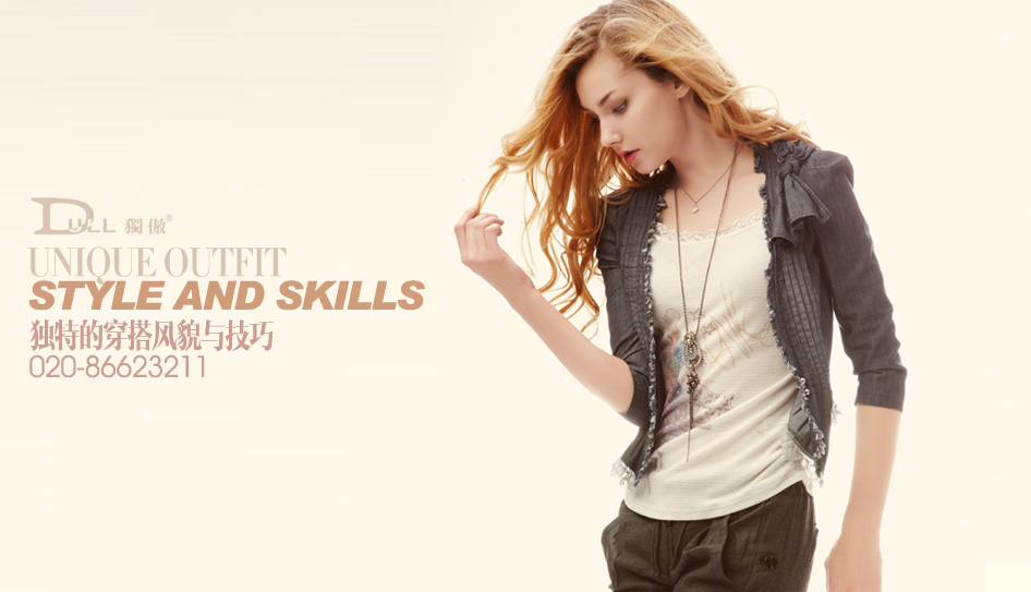 DULL服饰开发有限公司,1991年成立于台湾,至今已经拥有了17年光辉发展。 2002年在中国广州,成立了一个直属公司,进行大陆市场的开拓与运作。广州DULL,不负重托,在最短的时间里完成了大陆时常的架构建设,并组建了一支精良的团队,该团队拥有两名台湾资深设计师担当国内设计部的总监工作,分别负责中国大陆长江以南和以北的设计风格线路,并有一名拥有多年女装市场运做经验的营销总监,来知道数名业内精英人士进行大陆市场的业务开拓及客户维护;结合精良高质高效的生产线有效的完成了公司在大陆集开发、生产到市场营销为一体的网络物流化管理及运作。让DULL在众多同类品牌中,以更高的层面参与大陆市场,进行品牌运作。 Dull服装品牌自由表现出新女性的自信、美丽、坚强,更为独立从而更加成功。国际化、大气的时尚视角,实用的设计语言,是设计师的完美坚持。栽剪舒适自然和细节追求相结合的主体,突出Dull品牌的经典风格。无论流行如何演变,最新时尚线条的转化于适用。让独傲的女人就是能够在时尚艺术于现代感之间达到平衡。 |