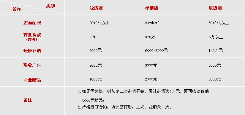 货源保证: 公司与国内、外近千家知名品牌女装的厂家,建立长期合作关系,专门代理各种定单尾货、计划外及内销的精品服饰,品种齐全,款式新颖,确保每天都有不同的新款及时供应。 价位低廉: 无任何中间环节,一站式供货,所有产品均以原产家吊牌的1~1.5折,供客户自由选货,保证所有产品在全行是最低价格。 利润保证: 客户挑选的产品,以2~4折的实惠价格销售,确保至少有:1~2倍的利润。 独家代理: 确保所有加盟商,都享受特定的区域保护,杜绝无序经营等。 总部支持: 凡是新开的店面,总部都将给予:免费的形象设计,免费的装修方案,并赠送门头、背景与广告。并且有专业的督导提供营业员的培训及管理,即使是新手,也会游刃有余,彻底解决您的后顾之忧! 跨季换货: 所有产品均为按进价的金额,您再也不用压货,真正的零库存。 新款及时: 您可以足不出户,每周都会收到总部的新款图片及样衣,并由总部安排一对一的客服人员,为您提供高效、优质的售后服务。 统一货运: 总部拥有完善的物流体系,确保您在任何省份都能及时收到货品。 促销活动: 总部免费提供:节假日、店庆等超人气的促销宣传方案。 杭州市萍叶服饰-开店标准