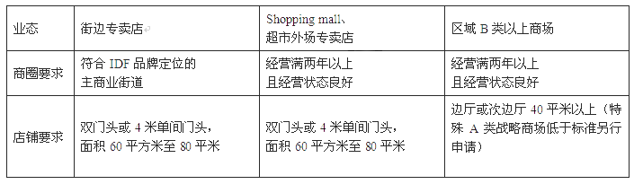 加盟优势 → 公司实力强,在全国服装企业排名前三名。 → 扶持力度大,有专门的服装大学给代理商做后援。 → 公司免费送道具 → 公司协助给经销商店面选址 → 公司派人到店指导开业 → 运营人员每天跟进店铺运营情况,协助客户进行货品分析。 → 全部产品总部设计研发,有市场竞争力,紧跟时尚潮流的款式设计 → 产品都是质检合格的,公司是长三角的质检体系的检测公司 商圈及店铺要求