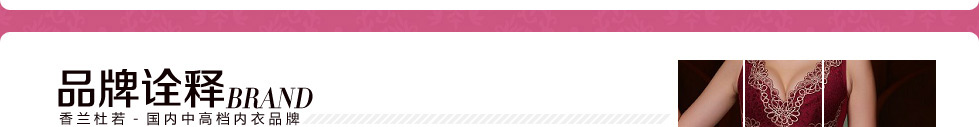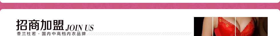 香兰杜若内衣品牌创于2009年,产品涵盖各类女士内衣,主打产品为功能调整型文胸; 2010年香兰杜若内衣加盟、内衣代理、内衣专卖、内衣连锁全国招商计划正式启动, 招商理念:合作共赢,稳健发展。 品牌宗旨:责任与健康同行,美丽与时尚并存 品牌理念:关爱女性•关注健康 品牌追求:成为中国"健康•时尚"内衣连锁行业第一品牌 品牌定位: ①风格定位:舒适•健康•时尚•典雅 ②价格定位:138—268元/件,中价位:398-1380元,高价位1380-3980元:18-50岁,具有生活品位,懂得悦己和享受生活,追求健康舒适与时尚典雅的现代女性。 |
